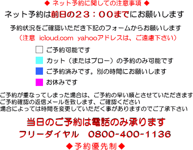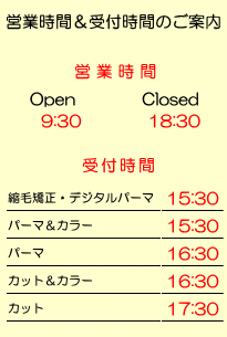 ダブルカラー(ブリーチしてからのオンカラー)等の特殊なカラーなどの受付時間は上記の限りではございません。
